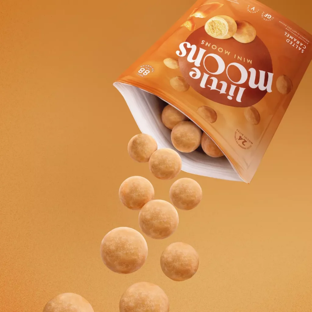 Salted caramel cheesecake bites wrapped in a sweet rice dough (50%). Ingredients: Mascarpone (milk), sugar, water, rice flour, full fat soft cheese (full fat soft cheese (milk), sea salt), light brown sugar (sugar, cane molasses), trehalose*, chicory root fibre, caramel paste (0.7%) (glucose syrup, caramel sugar syrup, invert sugar syrup, natural flavouring), rice starch, tapioca starch, stabilisers (xanthan gum, guar gum), natural flavouring, emulsifier (soya lecithin), salt, colour (annatto norbixin), soybean powder. *Trehalose is a source of glucose.